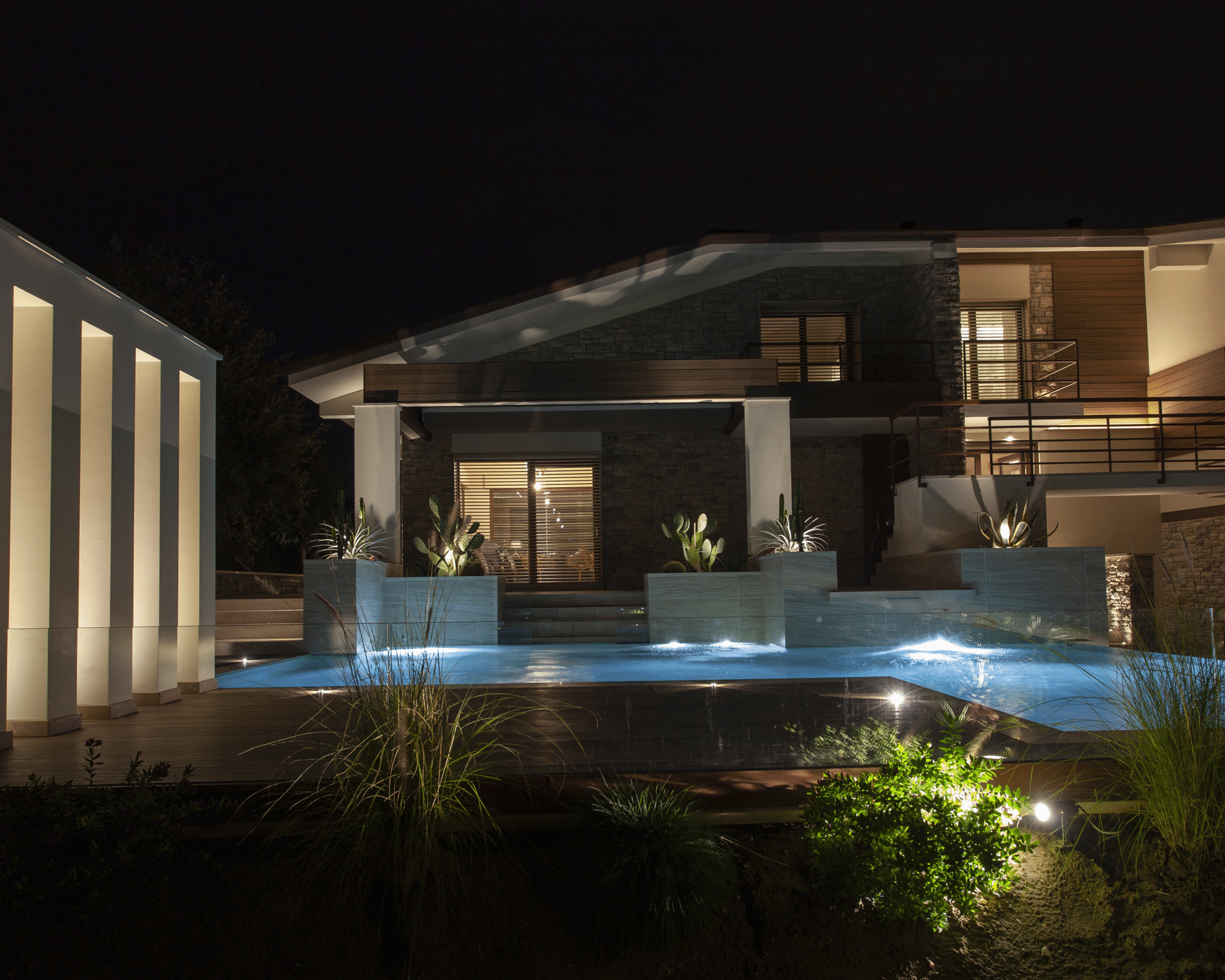 I pavimenti interni sono in parquet Original Parquet, che dona calore e luminosità agli spazi, mentre la zona piscina è stata realizzata con grès strutturato Marazzi Travertino Marbleplay, noto per la sua resistenza agli agenti atmosferici. Le finiture interne sono state completate con lastre REX Florim I Classici, perfette per chi cerca un tocco elegante ma duraturo nel tempo.