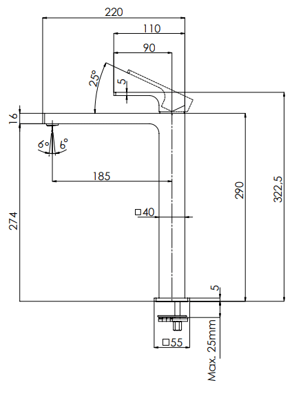 Monocomando lavabo alto senza foro sul corpo, con scarico click-clack con troppo-pieno.