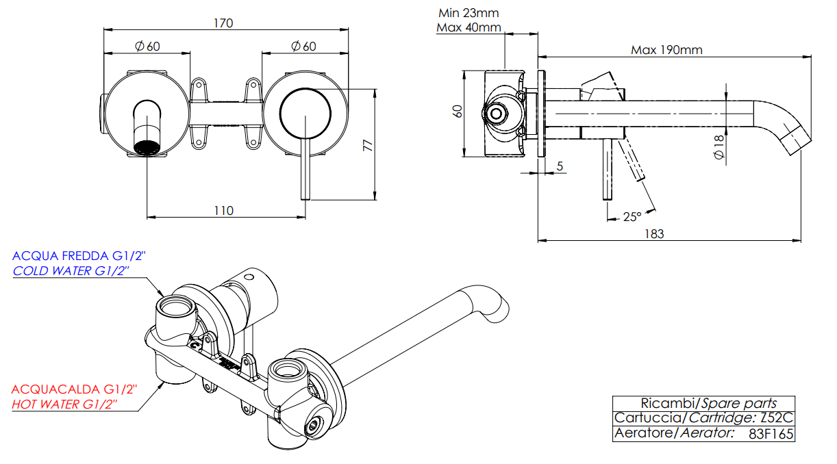 La linea è dotata di cartuccia a dischi ceramici Ø 25 mm.