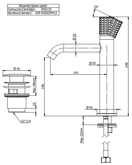 Miscelatore monocomando per lavabo, modello “A” altezza media, con scarico click-clack con troppo-pieno incluso.