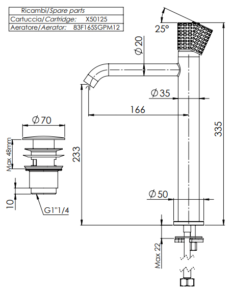 Miscelatore monocomando alto per lavabo, misura XL, scarico click-clack con troppo-pieno incluso