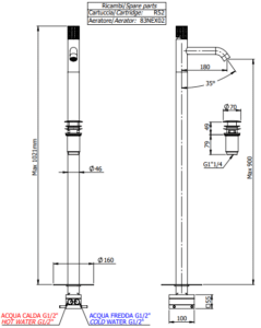Miscelatore monocomando lavabo da terra con scarico click-clack con troppo pieno.