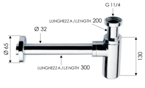 Sifone "minimal” in ottone cromato, per lavabo, 1”1/4, canotto cm 30 e rosone pesante.