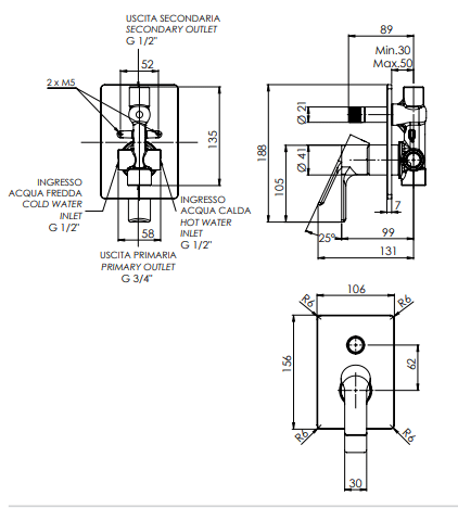 Miscelatore a incasso per vasca/doccia con deviatore a 2 vie a vitone ceramico, su piastra rettangolare. Per selezionare l’uscita desiderata, la manopola del deviatore deve essere ruotata da una posizione all’altra.